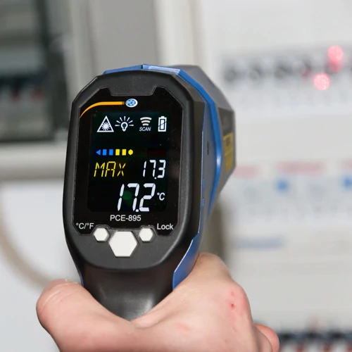 KEY FEATURES● Non-contact temperature measurement● 60:1 optics ● Temperature measurement up to 1600°C / 2912°F ● Compact cross laser thermometer ● Double laser shows the spot diameter ● Adjustable emissivity ● Adjustable emissivity ● Alarm function Typical applications of Dual Laser Infrared Thermometer PCE-895