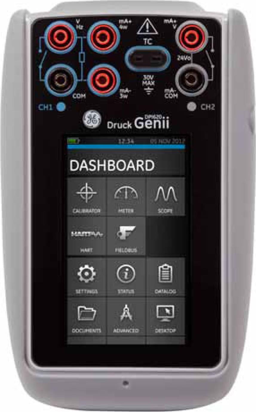 This ultra-compact electrical, frequency and temperature calibrator with full HART communicator and optional Foundation Fieldbus communicator provides simultaneous measurement and source capabilities for the setup, testing and calibration of most types of process instruments including transmitters, transducers, gauges/indicators, switches, proximity detectors, counters, RTDs, thermocouples and valve positioners. What’s new in Genii compared to the old DPI 620? • Smart phone technology touch display and new UI (User Interface) supporting gestures and swipes for a flatter menu structure and greater ease of use.
