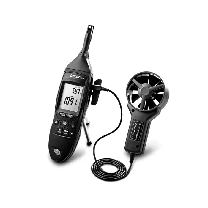 Product Overview:The FLIR EM54 is ideal for inspecting and troubleshooting HVAC/R ducting systems within residential, commercial, and industrial facilities. This meter can help you verify that duct inlets and outlets have the specified volumetric flow – a prerequisite to an efficient functional system. Featuring humidity, wet bulb, and dew point functions, the EM54 can measure deviations from proper relative humidity levels. Plus, the included Type-K contact temperature probe is useful to check electric motors and thermal equipment components for proper operating temperatures. |