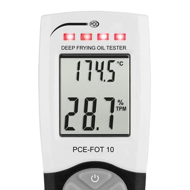 PRODUCT OVERVIEWOil quality meter with 3-digit LCD / Backlit / IP65 protected / Status LEDs (blue, green, red) / Display of PC value between 0.5% to 40% / Automatic switch-off functionThe oil quality measuring device PCE-FOT 10 is a measuring device with which you can determine the quality of various types of oil. This oil quality meter is also successfully used by food inspectors. A measurement is carried out directly in hot fat. For this, the measuring tip is held directly in a fryer or the like. Thus, fast measurement results are guaranteed. The oil temperature in °C or °F and the oil quality in percent PC (polar compounds) are determined within a few seconds. The PC value is a measure of the thermal-oxidative stress level of a frying oil. On the device itself, a traffic light function is installed, so that the oil quality is displayed directly in color. This oil tester is not only used by food inspectors, but also in gastronomy. According to the recommendations of the DGF (German Society for Fat Science) 24 percent polar components (Polar compounds) are to be regarded as a limit to the healthiness of a deep-frying fat. When old fat is used, it generally has many disadvantages. This includes influencing the taste and the associated reduced quality. In addition, it can cause strong odor and smoke, if the fat is not examined with an oil tester. National regulations regarding maximum PC limits are to be observed if necessary. Since not all oils behave exactly the same, different calibrations can be stored and called up in the oil quality measuring device. There are four fixed storage locations (semi-liquid, liquid, solid) as well as 6 variable storage spaces. |