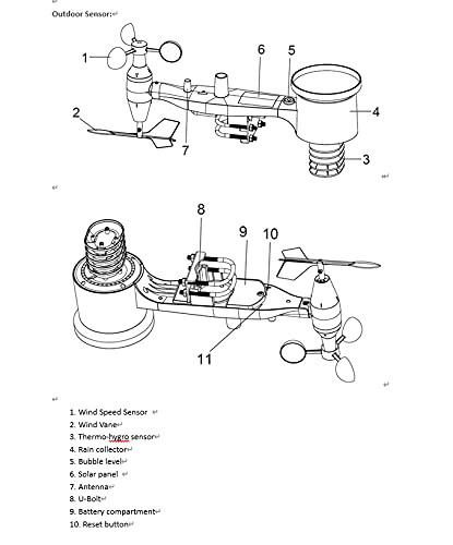 lTouch screen panel lIt can measures: Wind speed, wind direction, rain, temperature (outdoor & indoor), humidity (outdoor & indoor), atmosphere pressure. lIt transmits data from the outdoor sensor array to the receiver wirelessly(433Mhz). lThe device (indoor ) can be connected to PC by USB cable. In the software, PC can view the current information from the device, and export the history data into computer(format:csv) lThe data can be uploaded to the website(www.wundergound.com) via PC, when the PC is connecting to the internet. Functions: 1) Free PC software to view the weather data, after PC connecting to the receiver(display). (remark: software language: Chinese, Czech, Danish, Deutsch, English, French, Hungarian, Polish, Svenska, Spanish) 2) USB port for easy connection to your PC to view the weather data. 3) History Record interval is: 1-240minutes(adjustable). The receiver can log 3552 records in total. 4) Rainfall data (inch or mm): 1-hour, 24-hour, one week, one month and total since last reset. 5) Wind chill and Dew point temperature display ( °F or °C) 6)Records min. and max. wind chill and Dew point with time and date stamp 7) Wind speed (mph, m/s, km/h, knots, Beaufort) 8) Wind direction display with LCD compass 9) Weather forecast tendency arrow 10) Weather alarm modes for: a) Temperature b) Humidity c) Wind chill d) Dew point e) Rainfall f) Wind speed g) Air pressure h) Storm warning 11) Forecast icons based on changing barometric pressure 12) Barometric pressure (inHg or hPa) with 0.1hPa resolution 13) Wireless outdoor and indoor humidity (% RH) 14) Records min. and max. humidity with time and date stamp 15) Wireless outdoor and indoor temperature (°F or °C) 16) Records min. and max. temperature with time and date stamp 17) 12 or 24-hour time display 18) Perpetual calendar 19) Time zone setting 20) Time alarm 21) High light LED backlight 22) Wall hanging or free standing |