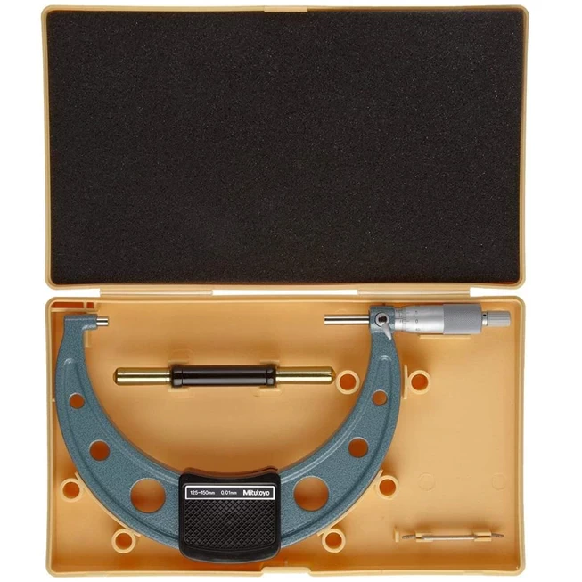 The Mitutoyo 103-142 Outside Mechanical Micrometer features a hammertone, green, baked-enamel finished frame and Carbide tipped measuring faces. This model includes a Ratchet Stop and a Measuring Range of 125-150mm.