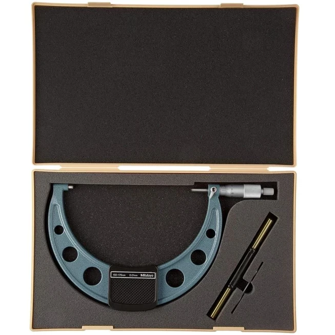 The Mitutoyo 103-143 Outside Mechanical Micrometer features a hammertone, green, baked-enamel finished frame and Carbide tipped measuring faces. This model includes a Ratchet Stop and a Measuring Range of 150-175mm.
