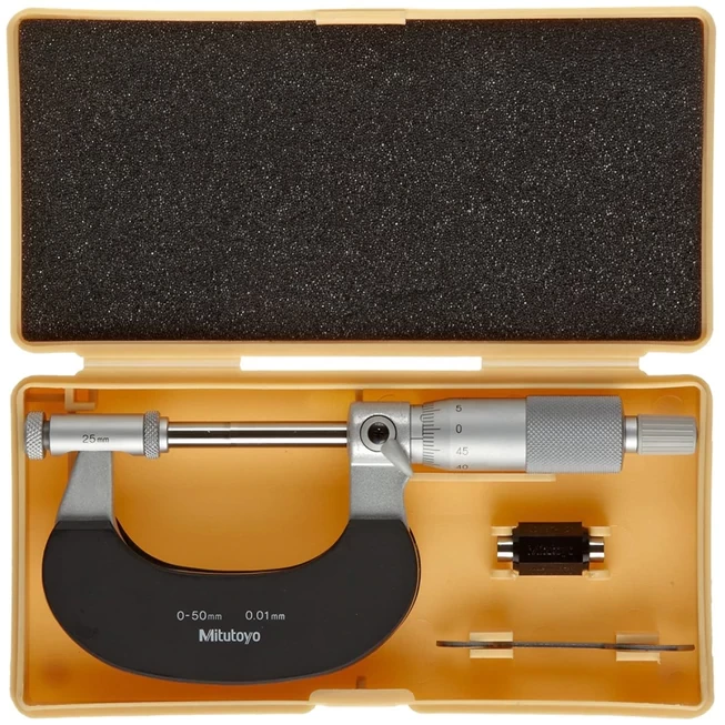 The Mitutoyo 104-171 Outside Micrometer with Interchangeable Anvils has the following specifications:● Range: 0-50mm● Graduations: .01mm ● Mass(kg): 0.32 ● Remarks: With 2 Anvils & 1 Standard ● With Ratchet Stop  |