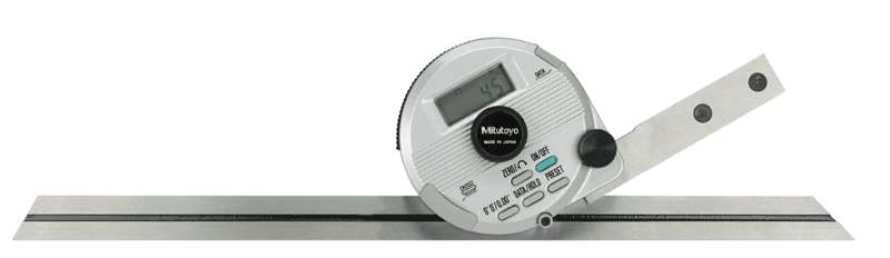 This is a Digimatic Universal Protractor with data output that offers you the following features:● It has an easy-to-read digital display.● It automatically turns off after 10 minutes, and gives you fixed reference points for easy adjustment. ● You can slide and clamp the measuring blade over the entire length. ● You can make fine adjustments to precisely adjust arbitrary angle dimensions. ● It comes with a mounting facility on height gauges and tracers of series 192 via holder.  |