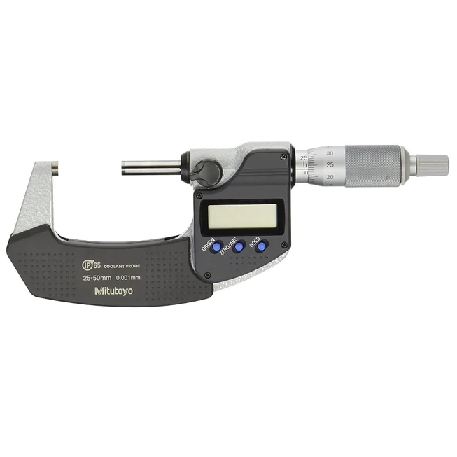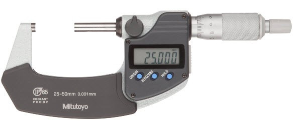 SPECIFICATION:● Range: 25-50mm● Resolution: 0.001mm ● Accuracy: +/- 0.001mm ● SPC Output: No ● Ratchet Stop ● Flatness: 0.000012"/0.0003mm ● Parallelism: 0.00004"/0.001mm for models up to 2"/50mm ● Measuring faces: Carbide tipped ● Display: LCD ● Battery: SR44 ● Battery life: Approx. 1.2 years under normal use (8 months: over 100mm models) ● Dust/Water protection level: IP65  |