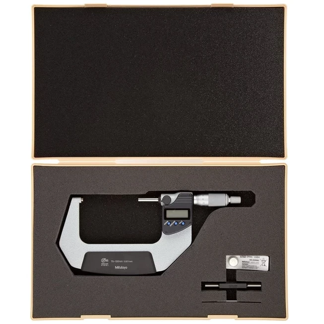 SPECIFICATION:● Range: 75-100mm● Resolution: 0.001mm ● Accuracy: +/- 0.002mm ● SPC Output: No ● Ratchet Stop ● Flatness: 0.000012"/0.0003mm ● Parallelism: 0.00008"/0.002mm for models up to 4"/100mm ● Measuring faces: Carbide tipped ● Display: LCD ● Battery: SR44 ● Battery life: Approx. 1.2 years under normal use (8 months: over 100mm models) ● Dust/Water protection level: IP65  |