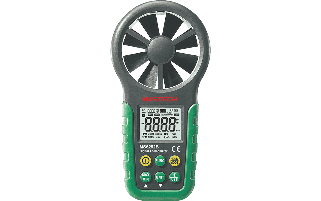 | Features: Air Volume Unit Range Area CFM: 0~999.9 0~9.999 ft² CMM: 0~999.9 0~9.999 m² CMS: 0~99.99 0~9.999 m² ● Display 9999 counts ● Auto Power Off ● Flow Area Setting ● MAX / MIN ● Data Hold ● Display Backlight ● Low Battery Display ● ℃/℉ Selection ● Ambient ● Dew Point ● Wet Bulb ● Temperature ● USB Interface |