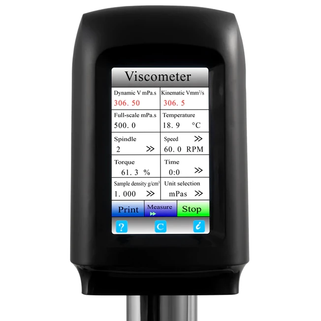 KEY FEATURES● Viscosity measuring range: 10 ... 2,000,000 cP (various units can be displayed)● Accuracy: ± 1% of full scale (with Newtonian liquid) ● Rotation speeds: 0.3, 0.6, 1.5, 3, 6, 12, 30, 60 rpm ● 5" touch screen with simple interface ● Immersion temperature sensor up to 100 °C or 212 °F ● Spindle set consisting of L1, L2, L3, L4 ● Height adjustable approx. 25 cm ● Built-in bubble level for leveling ● Optional L0 spindle down to 1 cP |