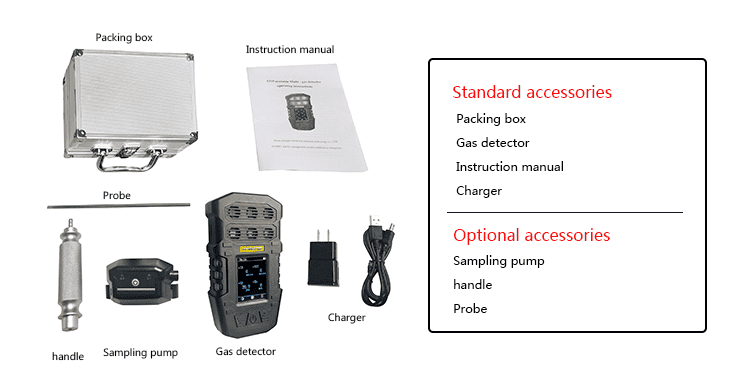 Product IntroductionZhongAn S318 multi-gas detector uses modular sensor elements, different sensors can be changedfor different gas.full English color LCD display technology, can be equipped with dozens ofcombustible and toxic gas for detection. ZhongAn S318 multi-gas detector is equipped with sound and light alarm, which can adapt toconcentration in more complex environment. This product is suitable for chemical, pharmaceutical, municipal, water treatment, telecommunications, archaeology, laboratory, refrigeration, wine and other places External pump, handle, probe and hose With Bluetooth printer to Download data through PC and make Excel report. |