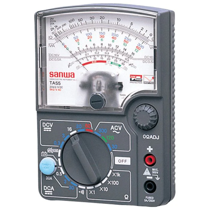 The Sanwa TA55 is a portable analog multimeter specifically designed for automotive applications, featuring a high DC current measurement range of up to 30A. Its design includes a clear, color-coded scale for improved visibility and ease of use in automotive environments. |