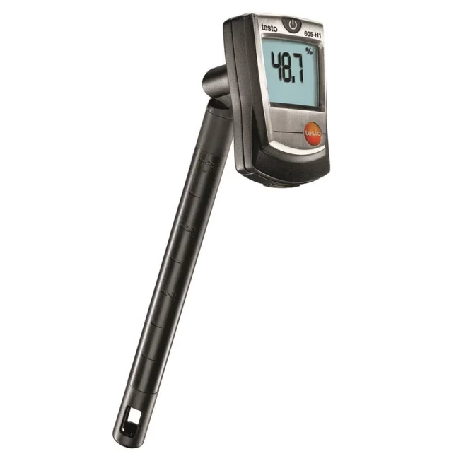 DESCRIPTION:If you are looking for a compact, user-friendly thermohygrometer, the testo 605-H1 is the ideal choice. It measures relative humidity and air temperature and also calculates the dew point in the -20 to +50 °C td range. The built-in Testo humidity sensor ensures reliable measurement results with long-term stability. The thermohygrometer is suitable for check measurements in production, storage, office and server areas. The testo 605-H1 is particularly practical for measurements in ventilation ducts, because it has a permanently mounted probe shaft (length: 125 mm). The bracket which is also supplied enables you to position and fix the probe shaft in the desired location in the ventilation duct. This means you can carry out your measurements without having to hold the thermohygrometer while doing so. The design of the testo 605-H1 temperature and humidity measuring instrument has been well thought through, right down to the details: the display can be pivoted into different positions, enabling the measuring values to be read off easily. |
