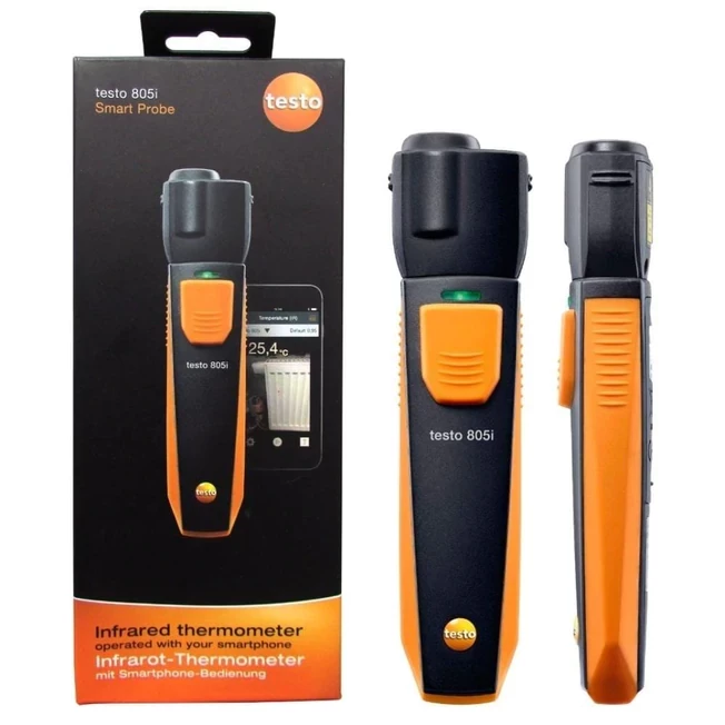 DESCRIPTION:The testo 805i infrared thermometer, in conjunction with a smartphone or tablet, functions as a compact IR thermometer for wall temperatures, as well as fuse and component temperatures in air conditioning systems. The measuring point is marked clearly with a laser circle made up of eight dots – so you always know precisely where to measure.