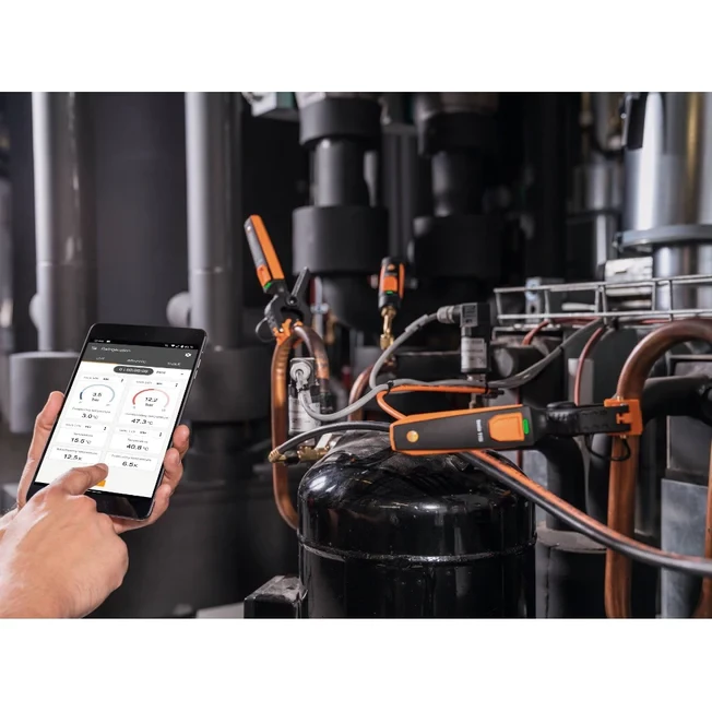 EQUIPMENT INCLUDES:● 2x Testo 549i high-pressure measuring instrument with smartphone operation, including batteries and calibration protocol● 2x Testo 115i clamp thermometer with smartphone operation, including batteries and calibration protocol ● Testo Smart Case “Refrigeration”, including foam insert TESTO 549I - HIGH-PRESSURE GAUGE OPERATED VIA SMARTPHONE Testo offers you greater mobility when measuring and used in conjunction with your smartphone or tablet. The handy testo 549i high-pressure gauge is suitable for carrying out wireless servicing and troubleshooting on air conditioning and refrigeration systems, as well as for installing them. The measuring instrument can be quickly and easily attached directly to the pressure connection. The testo 549i makes it considerably easier to work on pressure connections that are a long distance apart, thanks to wireless connection to a smartphone or tablet. Also practical, since no hoses are needed for the measurements, no refrigerant is lost, or only a very small quantity. When used in conjunction with the testo 115i clamp thermometer, individual refrigeration system parameters can also be calculated. |