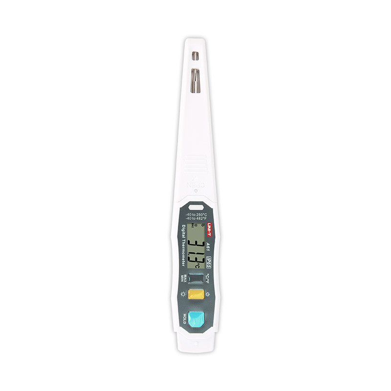 | Description: A61 is an IP65 rated thermometer with FDA certified stainless steel probe. It is equipped with a protective shell to prevent accidental skin puncture and burning. With its portable pen-like design, clear backlight display, and auto power off functions, A61 is a useful temperature measurement tool for cooking, refrigeration, heating, food processing and other applications. |
