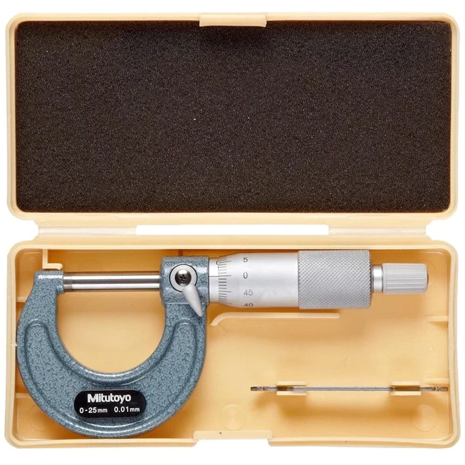 The Mitutoyo 103-137 Outside Mechanical Micrometer features a hammertone, green, baked-enamel finished frame and Carbide tipped measuring faces. This model includes a Ratchet Stop and a Measuring Range of 0-25mm.