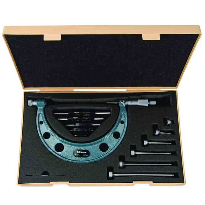 DESCRIPTION:This Mitutoyo vernier outside micrometer has a ratchet stop for constant force when measuring. Interchangeable anvils provide a wide measuring range. Supplied with zero-setting standards bar for each range. |
