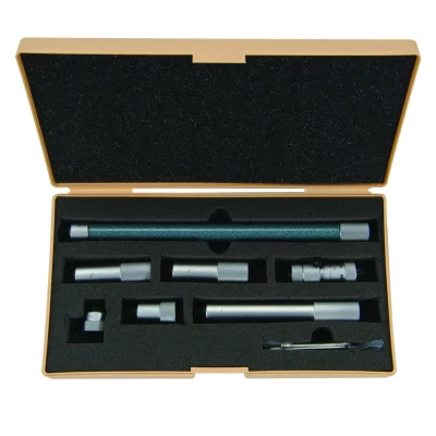 FEATURES:● Range: 2" - 20"● Travel of micrometer head: .5" ● Accuracy: +/-{.00015+.00005n+.00005R/2}* R=Maximum measuring length (inch) n=Number of rods Fraction rounded up ● Extension rods: .5", 1", 2" (2 pcs.), 4", 8" |