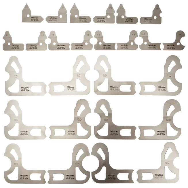 The Mitutoyo 186-902 Radius Gauge has the following technical specifications:● Range: 0.5 - 13mm by 0.5mm● Accuracy: +/- 0.05mm ● Composition of Leaves: 26 Leaves ● Remarks: 90 degree arc |