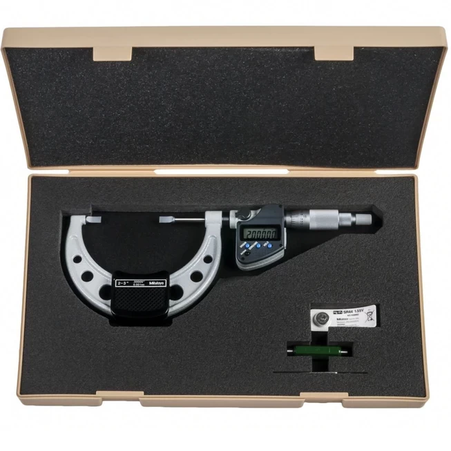 SPECIFICATIONS:● Range: 2-3"/ 50.8 - 76.2mm● Accuracy: +/- .00015" ● Resolution: .00005"/0.001mm ● Parallelism: .003mm / .00012" for models up to 75mm / 3" ● (3+R/100) microns for models over 75mm, ● R = max. range (mm) .00016" for 4" models ● Display: LCD ● Battery: SR44 (1 pc.), 938882 ● Battery life: Approx. 1.2 years under normal use |