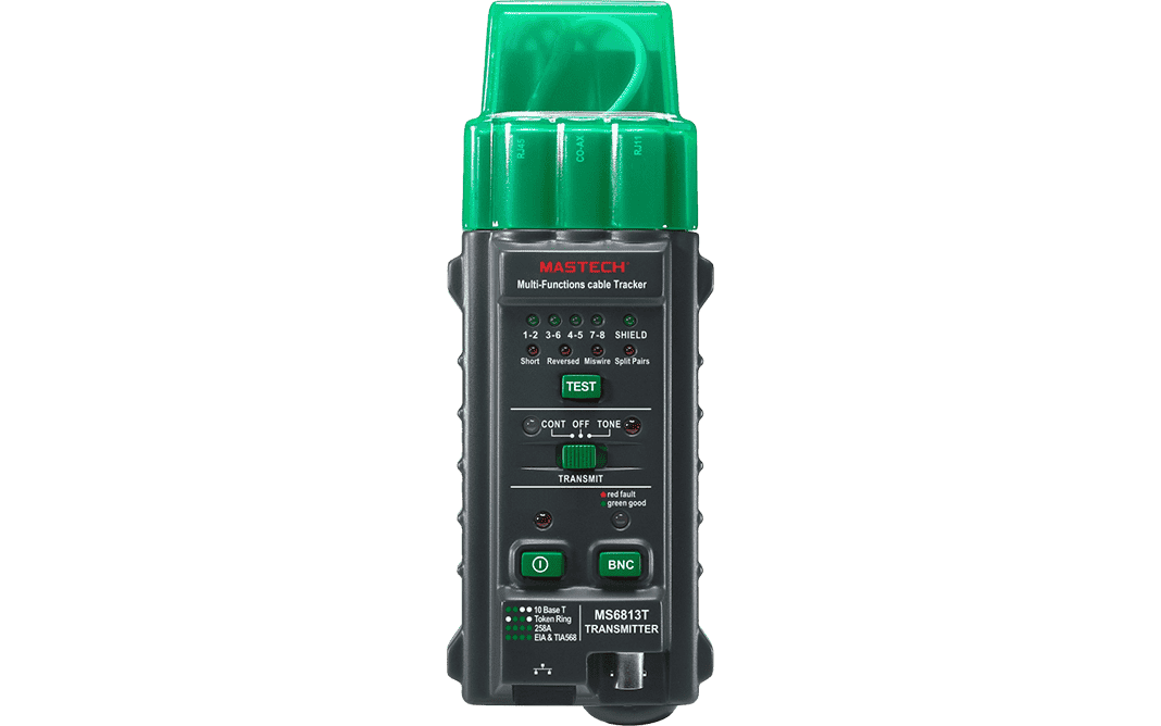 | Features: ● Testing Coaxial Cable (BNC) ● Twisted-wire-pair cables (RJ45): 10Base-T, T568A, T568B, Token Ring ● Testing Cable's Shield Integrity ● Judge Continuity of the Cables or Wires ● Track the cables or wires, and diagnose the break Point ● Receive the tone signal on the cables or wires(telephone line) ● Identify the state in the working telephone line(clear, ringing, busy) ● Send a Single Solid or a Dual Alternating Tone to the Target Cables or Wires |
