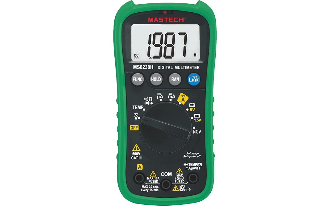 | Features: ● Display 4000 Counts ● Auto & Manual Ranging ● Auto Power Off ● True RMS For AC Voltage & AC Current ● Continuity Buzzer <50Ω ● Diode Open Voltage 3.2V ● Data Hold ● Low Battery Display ● Non-Contact Voltage Detector ● Battery Tester 1.5V/9V ● Wireless APP connection |