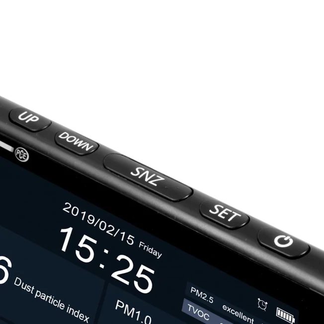 KEY FEATURES● Large color display● 7 in 1 air quality meter ● TVOC, HCHO, Temp., Airf., PM1, PM2.5, PM10 (Only displays in °C) ● Battery and mains operation, A/C power adapter ● 3 different display modes ● Alarm function |