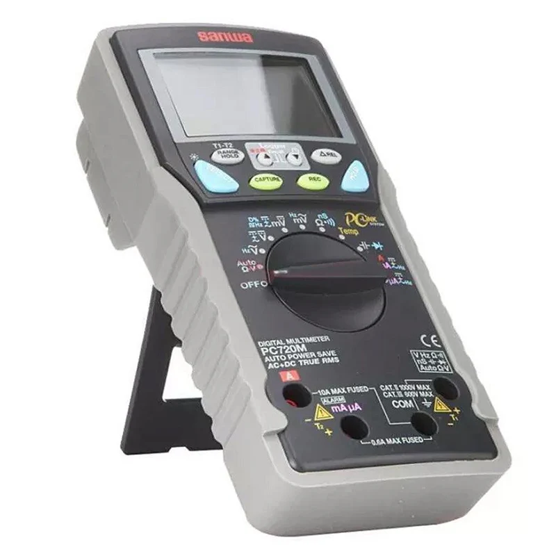 The Sanwa PC720M is a high-accuracy digital multimeter designed for professional use, featuring true-root-mean-square (True RMS) measurement, data logging, and PC connectivity. It is rated for low-voltage applications but can also handle measurements on main voltage outlets. |