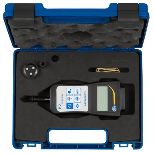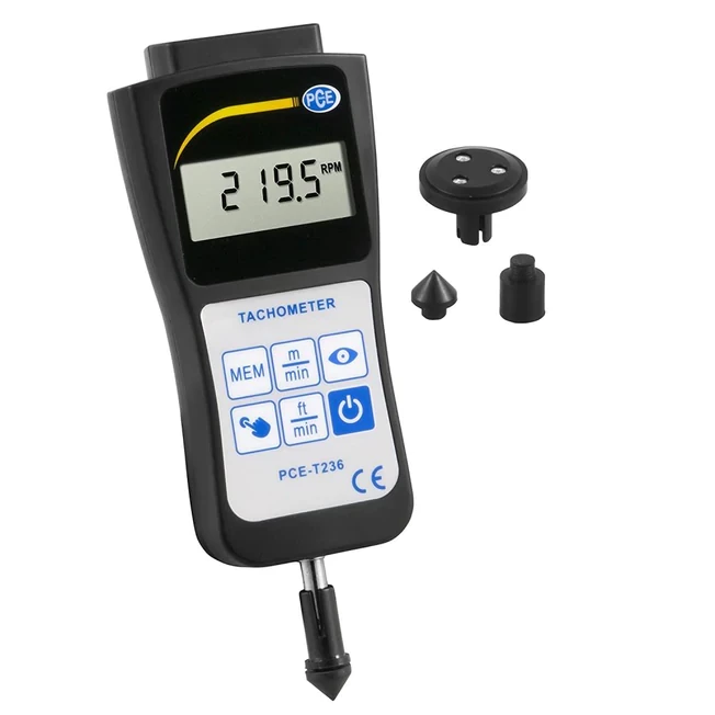 PRODUCT OVERVIEWPCE-T236 is a digital handheld tachometer or rotation meter for both contact and non-contact measurement. This tachometer measures rotation speed as well as linear or surface speed, displaying units in rpm, m/min or ft/min.The tachometer features an integrated laser and includes a mechanical attachment with contact probes, making it the ideal measuring instrument for machines, motors, conveyor belts and other moving parts. Non-contact measurements are taken with the help of laser-reflective tape that is fixed on the moving part. Contact measurements are taken using the mechanical attachments.