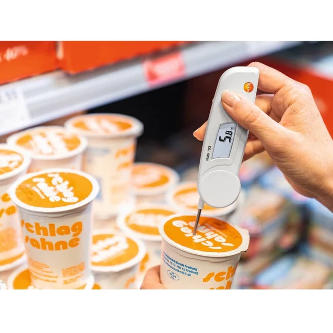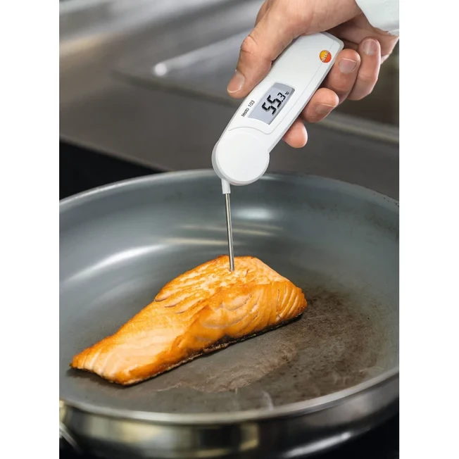 DESCRIPTION:Testo 103 Food Thermometer is just a little over 11 cm long, which makes it the smallest folding food probe thermometer in its class. It fact, it’s so small it fits in any shirt or trouser pocket, so it’s always with you when you need it and because the probe can be folded away when it’s not in use, there’s no need to worry that it might break off or cause any harm or damage. The testo 103 food probe thermometer can be used everywhere where food is sold, stored or processed. It is ideal for checking incoming goods, catering services, canteens and commercial kitchens, as well as cold storage rooms and supermarkets and for ensuring that temperatures are kept and quality and hygiene standards are met. The food thermometer’s especially thin but nonetheless rugged sensor tip makes it ideal for carrying out spot checks on liquid and semi-solid media where it leaves virtually no trace.