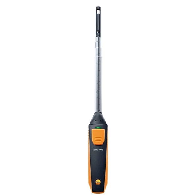 DESCRIPTION:No more surprises: the testo 405i thermal anemometer with smartphone operation from the Testo Smart Probes series is ideal for carrying out measuring tasks in ventilation ducts. It is easy to use the anemometer to determine air velocity, temperature and volume flows. The testo 405i is also suitable for measuring indoor air velocity. Practical when, for example, you want to locate non-airtight windows. Cooling capacities and heating outputs can also be calculated when used in conjunction with the testo 605i thermohygrometer.