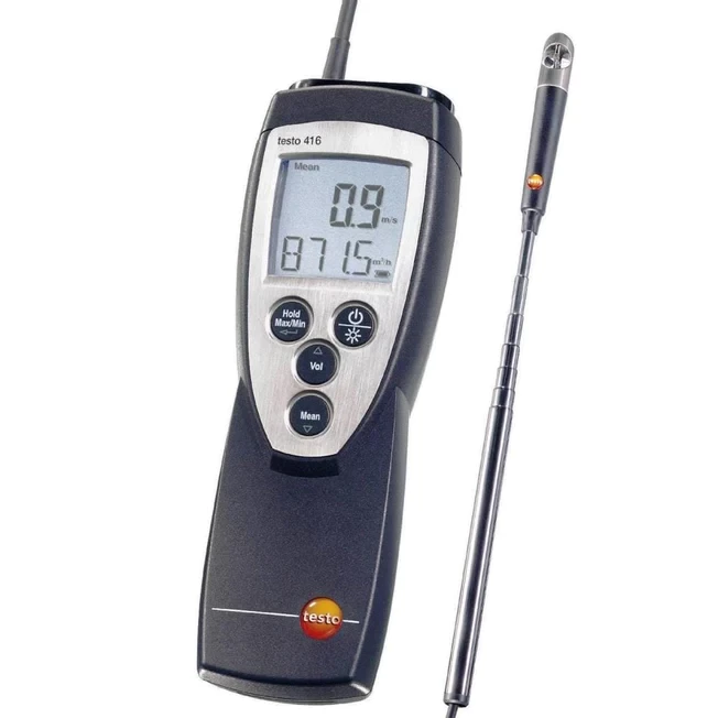 testo 416 vane anemometer with permanently connected 16 mm telescopic vane (max. length 890 mm), calibration certificate, batteries.