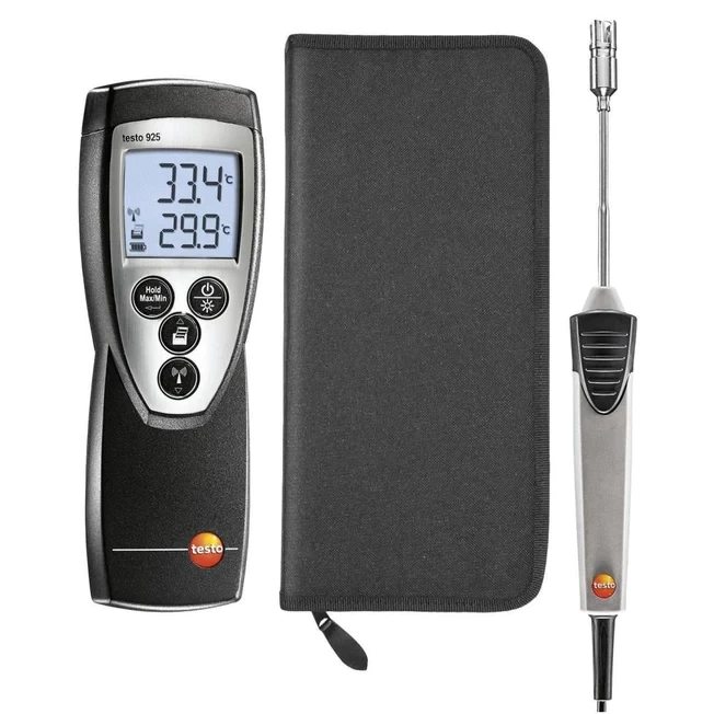 DESCRIPTION:The testo 925 temperature measuring instrument is our all-rounder for temperature measurement in heating engineering, the sanitation sector and refrigeration and air conditioning technology. Take advantage of the thermocouple technology of the attachable temperature probes (type K thermocouple) with this temperature measuring instrument. It enables fast temperature checks and a large temperature measuring range from -50 to +1000 °C (the measuring range is dependent on the probe selected).
