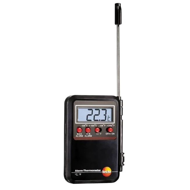 DESCRIPTION:The affordable testo mini thermometer with alarm function is small and handy but its performance is big. The penetration probe comes with a 80 cm cable and is fixed to the thermometer. The probe and cable can be stored easily and compactly on the temperature measuring instrument. An acoustic signal sounds when the temperature exceeds or falls below the individually adjustable limit values. The mini alarm thermometer is suitable for temperature measurement in air, in soft powdery substances and in liquids. Using the clips supplied, the mini alarm thermometer can be set up, mounted on the wall or attached (for practical transportation).