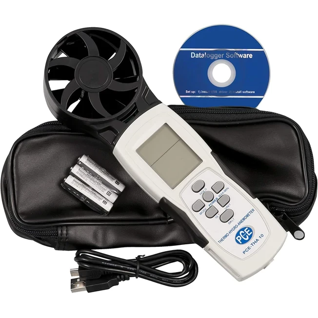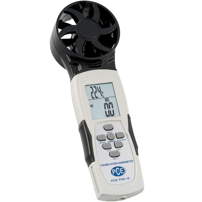 PRODUCT OVERVIEWMultifunction Anemometer with USB interface / Measurements up to 35 m/s / Calculation of air volume up to 9.999 m³/s / One-hand operation / Temperature measurements up to 50°C (122°F) / With backlightThe multifunction anemometer PCE-THA 10 with compact size, new structure and integrated vane anemometer is equipped with a one-hand operation. Besides the wind speed, the multifunction anemometer measures the temperature, the humidity, the dew point, wet bulb temperature and the air volume. It is possible to save 5 areas. The average wind speed can be determined from the 20 storable points. Min and Max function. It is possible to record a measuring with the HOLD-function. The multifunction anemometer is equipped with an easy to read, large display with switchable backlight and automatic cutoff. With the included software and USB cable, you can analyze the measurements at the computer. The multifunction anemometeris ideal for heating, ventilation, and air-conditioning engineers or for sailors to measure the wind speed on a sailing tour. |