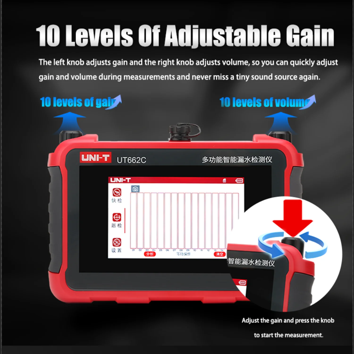 Multi-band Frequency Range: In quick check mode, the instrument can set multiple frequency ranges to adapt to different leak scenarios. Adjust high, mid, and low bands to exclude other frequency interferences. Manual adjustment is also possible in full-band mode. Effective Volume Display: Displays effective volume, excludes environmental noise, and focuses on leak volume. Effectively shields impact sounds and other noises, highlighting leak sounds and suspected leak sounds. Recording Function: Collects on-site leak sounds for archiving or comparison of multiple leak recordings. The recording time is 10 seconds. Screenshot Function: Capture screenshots of the display for documentation. PC Data Viewing: Enable the “PC data viewing” function in settings. Connect the device to a computer via USB to view captured screenshots and recording files. |